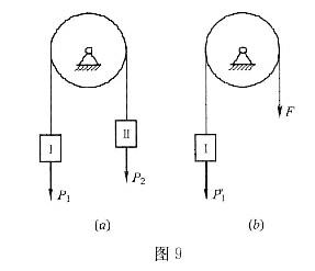 图9中鼓轮质量不计,P1,P2,F大小相同,系统处于平衡状态。问在下述两种情况下图(a)、图(b)中悬挂重物Ⅰ的绳的张力是否相等?()(1)在轮上加一相同力偶使物块Ⅰ加速下降。 (2)在物块Ⅰ上加一相同的力使之加速下降。
