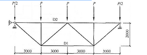 某露天环境的木屋架,采用云南松TC13A制作,计算简图如图所示,其空间稳定性满足《木结构设计标准》(GB50005—2017)的规定。P为檩条(与屋架上弦锚固)传至屋架的节点荷载。设计使用年限为5年,结构重要性系数γ0=1.0。 假设,杆件D1采用截面为正方形的方木,在恒载和活载共同作用下P=20kN(设计值)。试问,当按此工况进行强度验算时,其最小截面边长(mm),与下列何项数值最为接近? 提示:强度验算不考虑构件自重。