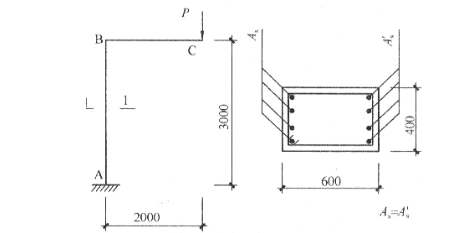 形普通钢筋混凝土构件,安全等级为二级,计算简图如图所示,梁、柱截面均为400mm×600mm,混凝土强度等级为C40,钢筋采用HRB400,as=as′=50mm,ξb=0.518。假定,不考虑地震设计状况,自重忽略不计。集中荷载设计值P=224kN,柱AB采用对称配筋。试问,按正截面承载力计算得出的柱AB单边受力钢筋As(mm2)与下列何项数值最为接近?