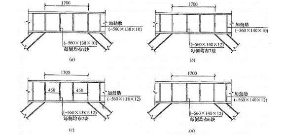 轴第20层消能梁段的腹板加劲肋设置如图所示,假定,消能梁段净长a=1700mm,截面为H600×300×12×20(0.15Af=839kN,Wnp=4.42×106mm3),轴压力设计值为N=800kN,支撑采用H型钢。试问,上述四种消能梁段的腹板加劲肋设置图,哪一种符合规范的最低构造要求?( )