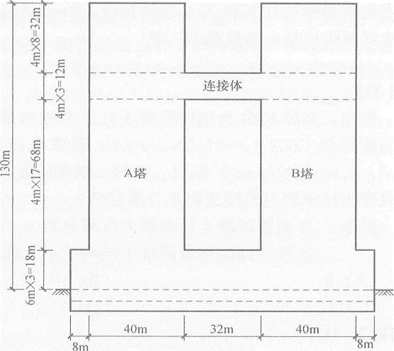 某现浇钢筋混凝土双塔连体结构,塔楼为办公楼,A塔和B塔地上31层,房屋高度130m,21~23层连体,连体与主体结构采用刚性连接,地下2层,如题31~32图所示。抗震设防烈度为6度,设计地震分组第一组,建筑场地类别为Ⅱ类,安全等级为二级。塔楼均为框架—核心筒结构,分析表明地下一层顶板(±0.000处)可作为上部结构嵌固部位。
