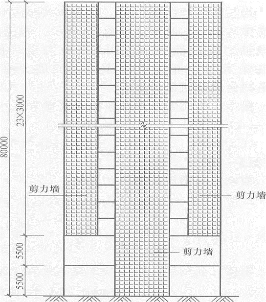 某25层部分框支剪力墙结构住宅,剖面如题28~30图所示,首层及二层层高5.5m,其余各层层高3m,房屋高度80m。抗震设防烈度为8度(0.20g),设计地震分组第一组,建筑场地类别为II类,标准设防类建筑,安全等级为二级。