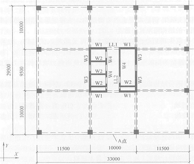 某31层普通办公楼,采用现浇钢筋混凝土框架—核心筒结构,标准层平面如题19~22图所示,首层层高6m,其余各层层高3.8m,结构高度120m。基本风压w0=0.80kN/m2,地面粗糙度为C类。抗震设防烈度为8度(0.20g),标准设防类建筑,设计地震分组第一组,建筑场地类别为Ⅱ类,安全等级二级。