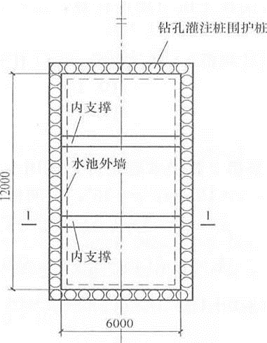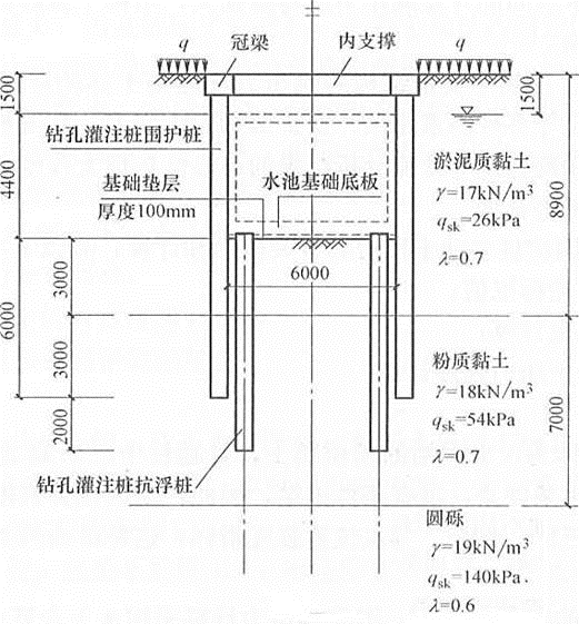某地下水池采用钢筋混凝土结构,平面尺寸6m×12m,基坑支护采用直径600mm钻孔灌注桩结合一道钢筋混凝土内支撑联合挡土,地下结构平面、剖面及土层分布如题1~5图所示,土的饱和重度按天然重度采用。