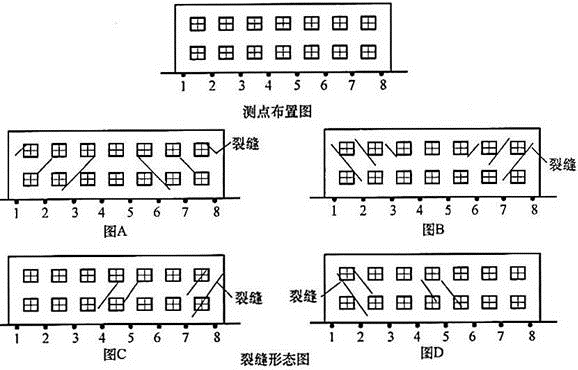 砌体结构纵墙等距离布置了8个沉降观测点,测点布置、砌体纵墙可能出现裂缝的形态等如题图所示。 各点的沉降量见下表: 试问,根据沉降量的分布规律,砌体结构纵墙最可能出现的裂缝形态,为下列何项( )