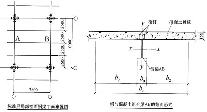 某综合楼标准层楼面采用钢与混凝土组合结构。钢梁AB与混凝土楼板通过抗剪连接件(栓钉)形成钢与混凝土组合梁,栓钉在钢梁上按双列布置,其有效截面形式如题图所示。楼板的混凝土强度等级为C30,板厚h=150mm,钢材采用Q235B钢。