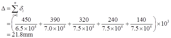 某五层钢筋混凝土框架结构办公楼,房屋高度25.45m。抗震设防烈度8度,设防类别为丙类,设计基本地震加速度0.2g,设计地震分组为第二组,场地类别Ⅱ类,混凝土强度等级C30。该结构平面和竖向均规则。 假定,各楼层的地震剪力和楼层的侧向刚度如表3所示,试问,当仅考虑剪切变形影响时,本建筑物在水平地震作用下的楼顶总位移Δ(mm),与下列何项数值最为接近()