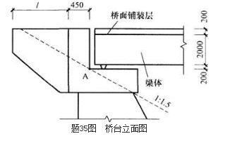 某公路桥梁桥台立面布置如题35图,其主梁高度2000mm,桥面铺装层共厚200mm,支座高度(含垫石)200mm,采用埋置式肋板桥台,台背墙厚450mm,台前锥坡坡度1:1.5,锥坡坡面通过台帽与背墙的交点 (A)。试问,台背耳墙最小长度l(mm)与下列何值最为接近?