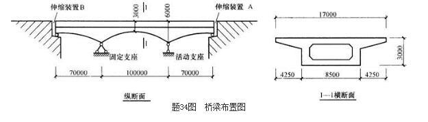 某公路上一座预应力混凝土连续箱形梁桥,采用满堂支架现浇工艺,总体布置如题34图所示,跨径布置为70m+100m+70m,在连梁两端各设置伸缩装置一道(A和