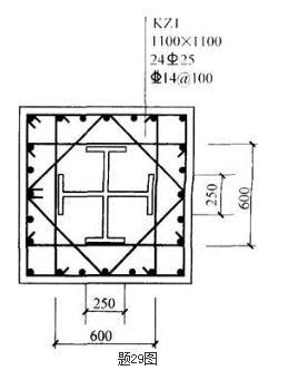 某型钢混凝土框架-钢筋混凝土核心筒结构,层高为4.2m,中部楼层型钢混凝土柱(非转换柱)配筋示意如题29图所示。假定,柱抗震等级为一级,考虑地震作用组合的柱轴压力设计值N=30000kN。钢筋采用HRB400。型钢采用Q3458,钢板厚度30mm(fa=295N/mm2)型钢截面积Aa=61500mm2,混凝土强度等级为C50,剪跨比λ=1.6。试问,从轴压比、型钢含钢率、纵筋配筋率及箍筋配箍率4项规定来判断,该柱有几项不符合《高层建筑混凝土结构技术规程》(JGJ3—2010)的抗震构造要求?