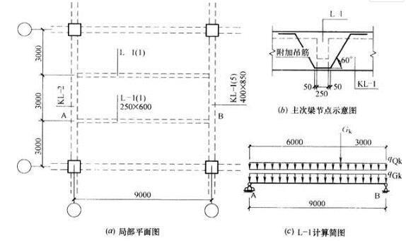 某办公楼为现浇混凝土框架结构,设计使用年限50年,安全等级为二级。其二层局部平面图、主次梁节点示意图和次梁L-1的计算简图如题1-3图所示,混凝土强度等级C35,筋均采用HRB400。 假定,次梁L-1传给主梁KL-1的集中荷载设计值F=220kN,且该集中荷载全部由附加吊筋承担。试问,附加吊筋的配置选用下列何项最为合适?