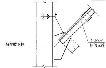假定,厂房位于8度区,支撑采用Q235,吊车肢下柱柱间支撑采用2L90×6,截面面积A=2128mm2。试问,根据《建筑抗震设计规范》(GB5011—2010)的规定,题22图柱间支撑与节点板最小连接焊缝长度l(mm),与下列何项数值最为接近?