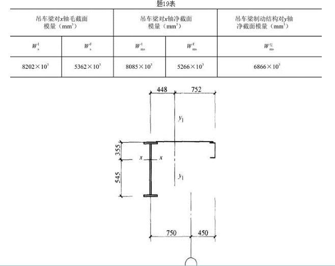 某冷轧车间单层钢结构主厂房,设有两台起重量为25t的重级工作制(A6)软钩吊车。吊车梁系统布置见题17-23图,吊车梁钢材为Q345。 吊车梁截面见题19图,截面几何特性见题19表。假定,吊车梁最大竖向弯矩设计值为1200kN·m,相应水平向弯矩设计值为100kN·m。试问,在计算吊车梁抗弯强度时,其计算值(N/mm2)与下列何项数值最为接近?