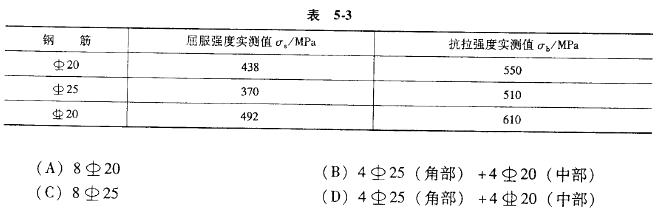 某高档超市为四层钢筋混凝土框架结构,建筑面积25000m2,建筑物总高度24m,抗震设防烈度为7度,II类场地。框架柱原设计的纵筋为822;施工过程中,因现场原材料供应原因,拟用表5-3中的钢筋进行代换。试问,下列哪种代换方案最为合适? 提示:下列4种代换方案均满足强剪弱弯要求。