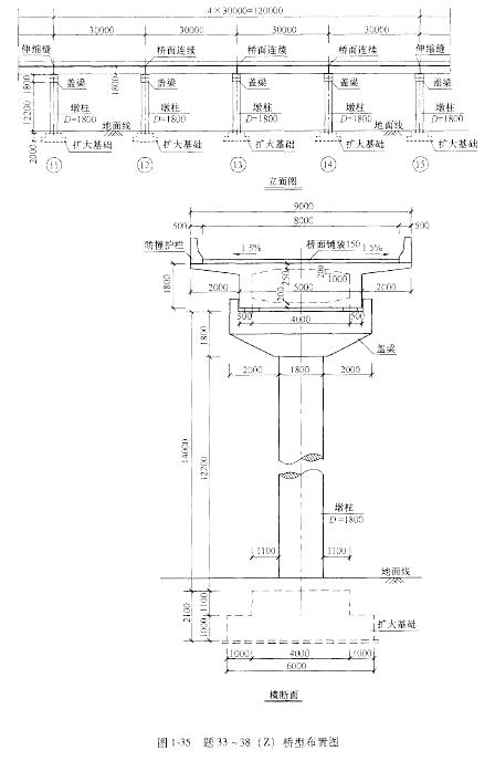 某城市快速路上的一座立交匝道桥,其中一段为四孔各30m的简支梁桥,其总体布置如图1-35所示。单向双车道,桥梁总宽9.0m,其中行车道净宽度为8.0m。上部结构采用预应力混凝土箱梁(桥面连续),桥墩由扩大基础上的钢筋混凝土圆柱墩身及带悬臂的盖梁组成。梁体混凝土线膨胀系数取