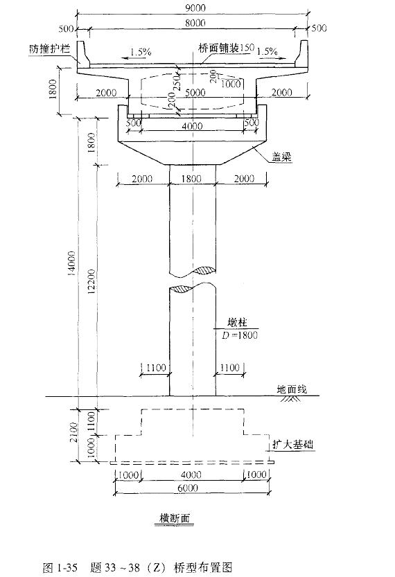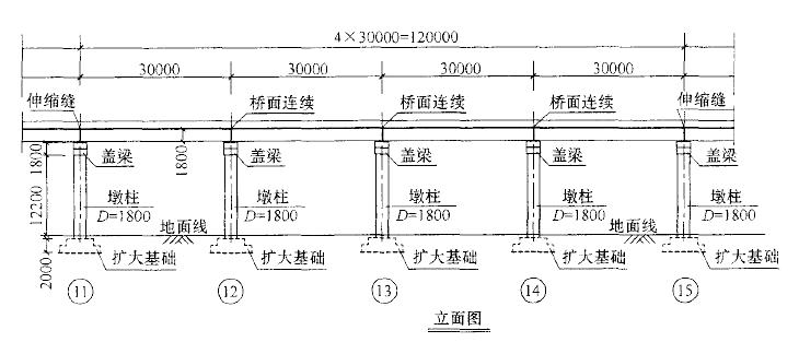 某城市快速路上的一座立交匝道桥,其中一段为四孔各30m的简支梁桥,其总体布置如图1-35所示。单向双车道,桥梁总宽9.0m,其中行车道净宽度为8.0m。上部结构采用预应力混凝土箱梁(桥面连续),桥墩由扩大基础上的钢筋混凝土圆柱墩身及带悬臂的盖梁组成。梁体混凝土线膨胀系数取