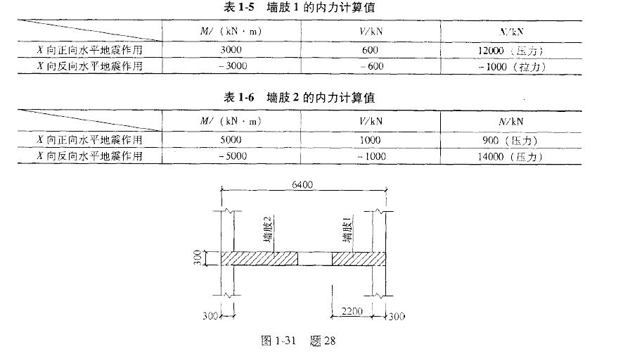 底层某双肢剪力墙如图1-31所示。假定,墙肢1在横向正、反向水平地震作用下考虑地震作用组合的内力计算值见表1-5;墙肢2相应于墙肢1的正、反向考虑地震作用组合的内力计算值见表1-6。试问,墙肢2进行截面设计时,其相应于反向地震作用的内力设计值M(kN.m)、V(kN)、N(kN),应取下列何组数值?提示:①剪力墙端部受压(拉)钢筋合力点到受压(拉)区边缘的距离