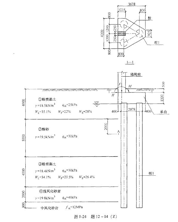 ,设计地震分组第一组,基础采用直径800mm泥浆护壁旋挖成孔灌注桩,图1-24为某边柱等边三桩承台基础图,柱截面尺寸为500mmx1000mm,基础及其以上土体的加权平均重度为20kN/m3。提示:承台平面形心与三桩形心重合。