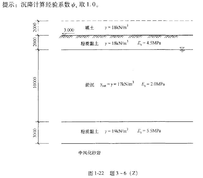 城市新区拟建一所学校,建设场地地势较低,自然地面绝对标高为3.000m,根据规划地面设计标高要求,整个建设场地需大面积填土2m。地基土层剖面如图1-22所示,地下水位在自然地面下2m,填土的重度为18kN/m3,填土区域的平面尺寸远远大于地基压缩层厚度。