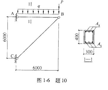 某外挑三角架,安全等级为二级,计算简图如图1-6所示。其中横杆AB为混凝土构件,截面尺寸为300mm×400mm,混凝土强度等级为C35,纵向钢筋采用HRB400,对称配筋,as=as'=45mm。假定,均布荷载设计值q=25kN/m(包括自重),集中荷载设计值P=350kN(作用于节点B上)。试问,按承载能力极限状态计算(不考虑抗震),横杆最不利截面的纵向配筋As(mm2)与下列何项数值最为接近?