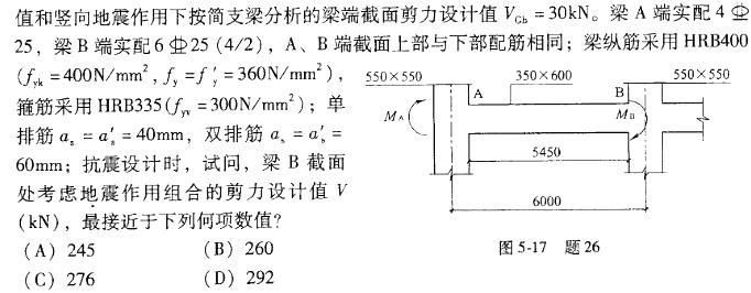 C.如图5-17所示。考虑地震作用组合的梁端弯矩设计值(顺时针方向起控制作用)为MA=250kN*m,MB=650kN*m;同一组合的重力荷载代表