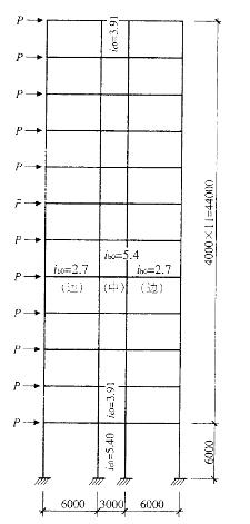 某12层现浇框架结构,其中一榀中部框架的剖面知图所示,现浇混凝土楼板,梁两侧无洞。底层各柱截面相同,2~12层各柱截面相同,各层梁截面均相同。梁、柱矩形截面线刚度ib0、ic0(单位:1010N*mm)注于构件旁侧。假定,梁考虑两侧楼板影响的刚度增大系数取《高层建筑混凝土结构技术规程》(JGJ3-2002)中相应条文中最大值。