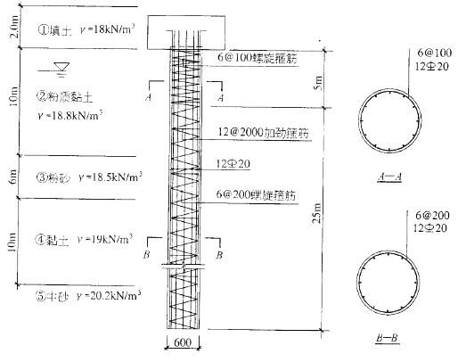 某桩基工程采用泥浆护壁非挤土灌注桩,桩径d为600mm,桩长l=30m,灌注桩配筋、地基土层分布及相关参数情况如图3-20所示,第③层粉砂层为不液化土层,桩身配筋符合《建筑桩基技术规范》(JGJ94-2008)第4.1.1条灌注桩配筋的有关要求。