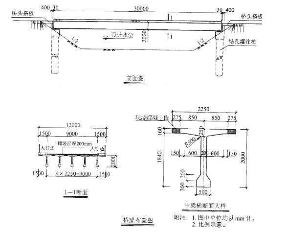 某二级干线公路上一座标准跨径为30m的单跨简支梁桥,其总体布置如图所示。桥面宽度为12m,其横向布置为:1.5m(人行道)+9m(车行道)+1.5m(人行道)。桥梁上部结构由5根各长29.94m、高2.0m的预制预应力混凝土T形梁组成,梁与梁间用现浇混凝土连接;桥台为单排排架桩结构,矩形盖梁、钻孔灌注桩基础。设计荷载:公路-I级、人群荷载3.0kN/m2。