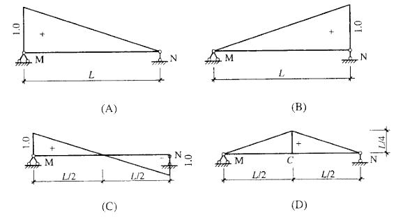 <p>某桥上部结构为单孔简支梁,试问,以下四个图形中哪一个图形是上述简支梁在M支点的反力影响线? 提示:只需要定性分析。 <