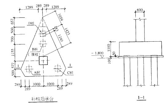 假定,柱只受轴心荷载作用,相应于荷载效应标准组合时,原设计单桩承担的竖向压力均为745kN,假定承台尺寸变化引起的承台及其上覆土重量和基底竖向力合力作用点的变化可忽略不计。试问,补桩后此三桩承台下单桩承担的最大竖向压力值(kN)与下述何项最为接近?