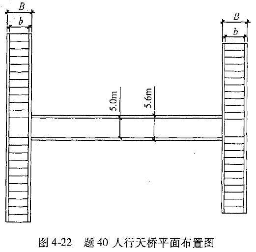 某城市一座过街人行天桥,其两端的两侧(即四隅)、顺人行道方向各修建一条梯道(见图4-22)天桥净宽5.0m、全宽5.6m。若各侧的梯道净宽都设计为同宽,试问,梯道最小净宽6(m)应为下列何项数值?