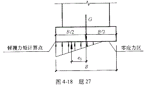 假定本工程设有两层地下室,如图4-18所示,总重力荷载合力作用点与基础底面形心重合,基础底面反力呈线性分布,上部及地下室基础总重力荷载标准值为 G,水平荷载与竖向荷载共同作用下基底反力的合力点到基础中心的距离为e0。试问,当满足规程对基础底面与地基之间零应力区面积限值时,抗倾覆力矩MR与倾覆力矩MOV的最小比值,与下列何项数值最为接近?