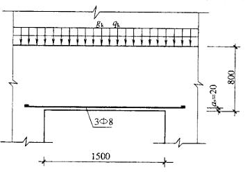 某住宅楼的钢筋砖过梁净跨=1.50m,墙厚为240mm,立面见图4-10,采用MU10烧结多孔砖、M10混合砂浆砌筑。过梁底面配筋采用3根直径为8mm的HPB235钢筋,锚入支座内的长度为250mm。多孔砖砌体自重18kN/m3。砌体施工质量控制等级为B级。在离窗口上皮800mm高度处作用有楼板传来的均布恒荷载标准值gk=10kN/m,均布活荷载标准值qk=5kN/m。