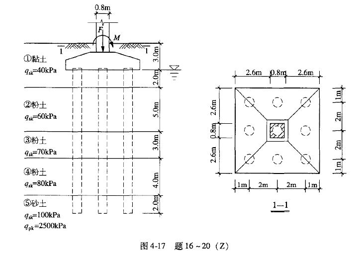 为0;相应于荷载效应基本组合时,由上部结构传至基础顶面的竖向力F为13000kN,力矩Mx为1560kN.m,My为0。基础及其上土的加权平均重度为20kN/m3,承台及方柱的尺寸、桩的布置以及各土层的地质情况见图4-17。提示:根据《建筑桩基技术规范》(JGJ94—2008)作答。