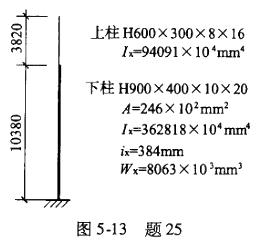 ?轴线边柱上端与屋面梁刚接,上、下段柱截面及截面特性如图5-13所示。下段柱轴力及弯矩设计值分别为N=1037kN,M×=830kN●m;排架平面内下段柱的计算长度系μ=1.3。试问,当对下段柱进行弯矩作用平面内稳定性验算时,截面上最大压应力设计值(N/mm2),应与下列何项数值最为接近?