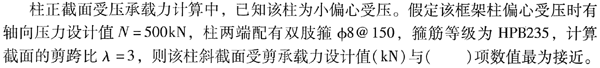 <p>假定框架梁柱节点核心区的剪力设计值Vj=1300kN,箍筋采用HRB335级钢筋,箍筋间距s=100mm,节点核心区箍筋的