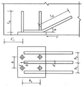 如图所示,由预埋板和对称于力作用线配置的弯折锚筋与直锚筋共同承受剪力的预埋件,已知承受的剪力V=225kN,直锚筋直径d=14mm,共4根,弯折钢筋与预埋钢板板面间的夹角α=30°,直锚筋问的距离b1和b均为100mm,弯折钢筋之间的距离b2=100mm,构件的混凝土为C30,钢板厚t=10mm,直锚筋与弯折锚筋均采用HRB335钢筋,钢板为Q235钢。