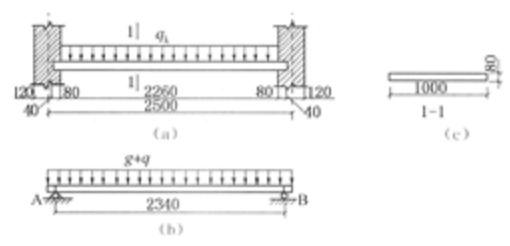 某宿舍的内廓为现浇简支在砖墙上的钢筋混凝土平板(图),板厚h=80mm,as=20mm,板上作用的均布活荷载标准值为qk=2kN/m2。水磨石地面及细石混凝土垫层共30mm厚(重度为22kN/m3),板底粉刷白灰砂浆12mm厚(重度为17kN/m3)。 恒载与活载设计值分别为()。