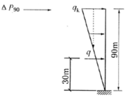 已知作用于90m高度屋面处的风荷载标准值wk=1.50kN/m2,作用于90m高度屋面处的突出屋面小塔楼风荷载标准值△P90=600kN。假定风荷载沿高度呈倒三角形分布,地面处为0,如图所示。则在高度z=30m处风荷载产生的倾覆力矩设计值最接近于()kN·m。
