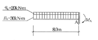 一商店建筑中有一挑出长度为8m的长悬挑梁,梁上作用着永久荷载标准值的线荷载gk=30kN/m,楼面活荷载标准值的线荷载qk=20kN/m(图6-9)。该建筑的抗震设防烈度为8度(0.30g)。由此可算得梁端A处的最大弯矩设计值MA=()kN·m。 提示:计算时应对有无竖向地震作用,以及比较永久荷载效应控制的组合与可变荷载效应控制的组合,然后确定最大弯矩设计值MA。