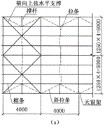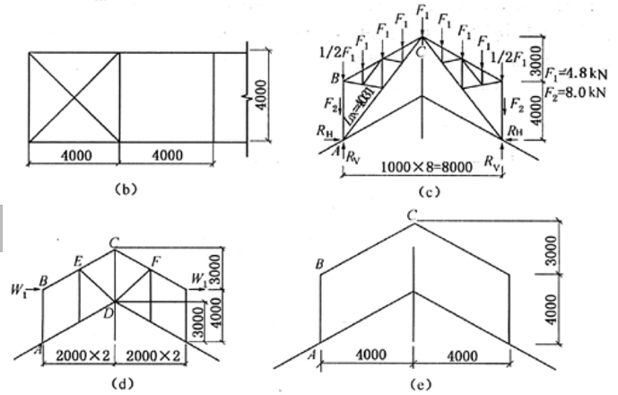 某厂房的纵向天窗宽8m、高4m,采用彩色压型钢板屋面、冷弯型钢檩条;天窗架、檩条、拉条、撑杆和天窗上弦水平支撑局部布置简图如图3-3(a)所示;天窗两侧的垂直支撑如图3-3(b)所示;工程中通常采用的三种形式天窗架的结构简图分别如图(c)、(d)、(e)所示。所有构件均采用Q235钢,手工焊接时使用E43型焊条,要求焊缝质量等级为二级。