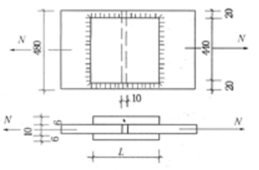 图为两块钢板用拼接板连接,采用三面围焊缝,承受静力荷载作用。 构件材料为Q345钢,焊条为E50型。焊脚尺寸hf=6mm,承受荷载N=1600kN,此连接需要的拼接板长度L最接近于()mm。
