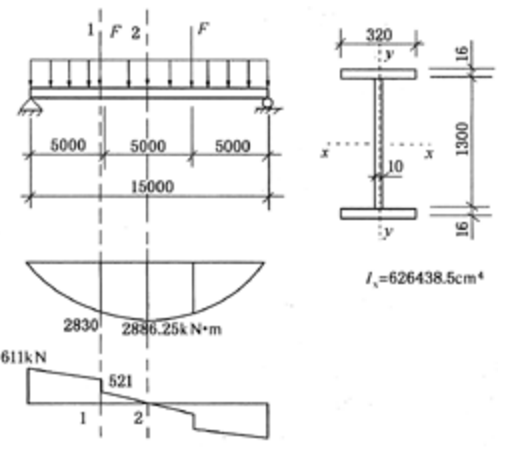 某车间操作平台梁,铰接于柱顶。梁跨度15m,柱距5m,梁上承受均布恒载标准值3kN/m2(已包括自重),在梁的三分点处各承受一个固定集中活载,其标准值为F=340kN,且在固定集中活载处有可靠的侧向支承点,钢材为Q345钢,焊条为E50系列。钢梁截面及内力计算结果如图3-10所示。 如图所示,验算此梁的折算应力时,应计算()。