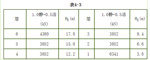 已知各层的计算高度和各层的重力代表值(1.0静载+0.5活载)如表4-3所示。三层的地震作用标准值F3(kN)与下列何项数值相接近()