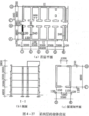 某四层砖砌体房屋的首层平面、剖面及屋顶间平面如图4-27。其中的屋顶间位于③、④轴间。抗震设防烈度8度,采用预制混凝土楼盖,横墙承重,首层底部固定于室外地面以下500mm。已知集中于各楼、屋盖的重力荷载代表值G5=150kN,G4=1450kN,G3=G2=2400kN,G1=2700kN。