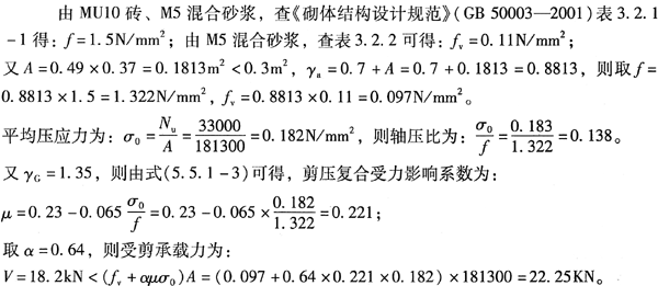 某三层商住楼,底层局部采用两跨连续墙梁结构。局部平面图及剖面如图4-8所示。开间为3.3m,底层层高3.9m,其余两层为3.0m,墙厚为190mm。托梁下均设有壁柱(每边凸出墙面200mm×590mm)。墙体采用MU10混凝土砌块和Mb10混合浆砌筑(f=2.79MPa)。楼盖及屋盖采用钢筋混凝土现浇板,厚120mm。托梁混凝土采用C30(fc=14.3N/mm2),纵向钢筋为HRB400(fv=360N/mm2),箍筋采用HPB235(f=210N/mm2)。屋面恒荷载标准值为4.8kN/m2,屋面活荷载标准值为0.5kN/m2,楼面恒荷载标准值为3.8kN/m2,活荷载标准值为2.0kN/m2,墙体自重标准值(包括双面粉刷)为2.61kN/m2,梁支座下设190mm×190mm上下贯通钢筋混凝土构造柱。托梁的截面尺寸bb×hb=250mm×600mm(石灰水粉刷)。各层墙顶均设截面为190mm×190mm的钢筋混凝土圈梁。