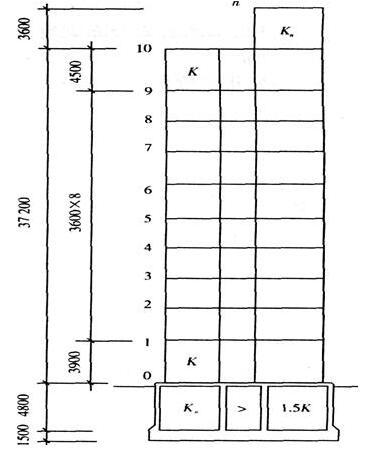 某10层现浇钢筋混凝土框架--剪力墙结构房屋,丙类建筑,剖面图如图22所示。其抗震设防烈度为8度,地震分组第二组,地震加速度0.20g,Ⅱ类场地。质量和刚度沿高度分布比较均匀,但屋面有局部突出的小塔楼。阻尼比s′=0.05。结构的基本周期T1=1.13s。各层的重力荷载代表值:G1=14000kN,G2=G3=G4=G5=G6=G7=G8=G0=0.9G1,G10=0.8G1,Gn=0.09G1,小塔楼的侧向刚度与主体结构的层侧向刚度之比Kn/K=0.05。