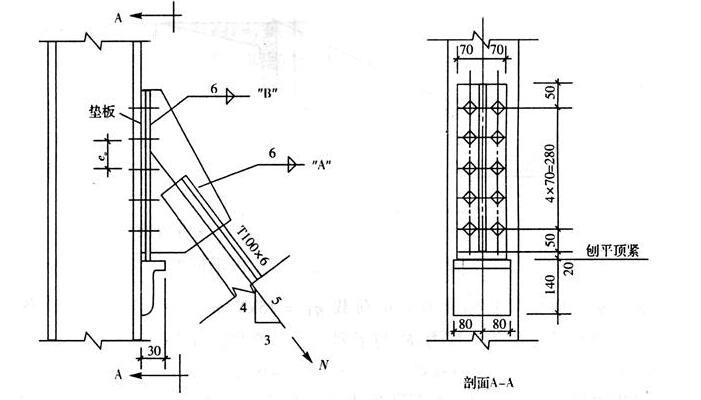 如图所示连接节点,斜杆承受轴心拉力设计值N=400kN,钢材采用Q235-BF(3号钢)焊接时,采用E43型手工焊条。高强螺栓连接时,采用摩擦型高强度螺栓M20,材质为20MnTi B,等级为10.9级,接触面喷砂处理。普通螺栓受拉连接时,采用M20普通螺栓,Q235钢(3号钢)制作,4.6级。 角焊缝“A”的长度是?( )