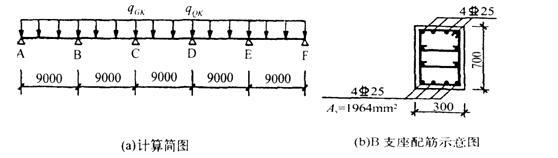 某钢筋混凝土五跨连续梁,其计算简图及B支座配筋如图3所示。混凝土强度等级为C30,ft=1.43N/mm2,ftk=2.01N/mm2,Ec=3.0104N/mm2,纵筋采用HRB400级热轧钢筋,Es=2.0105N/mm2。