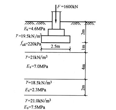 某柱下独立基础的底面尺寸为2.5m×2.5m,基础埋深2.0m,上部结构传至基础顶面的荷载准永久组合为F=1600kN。地基土层分布如图16所示。